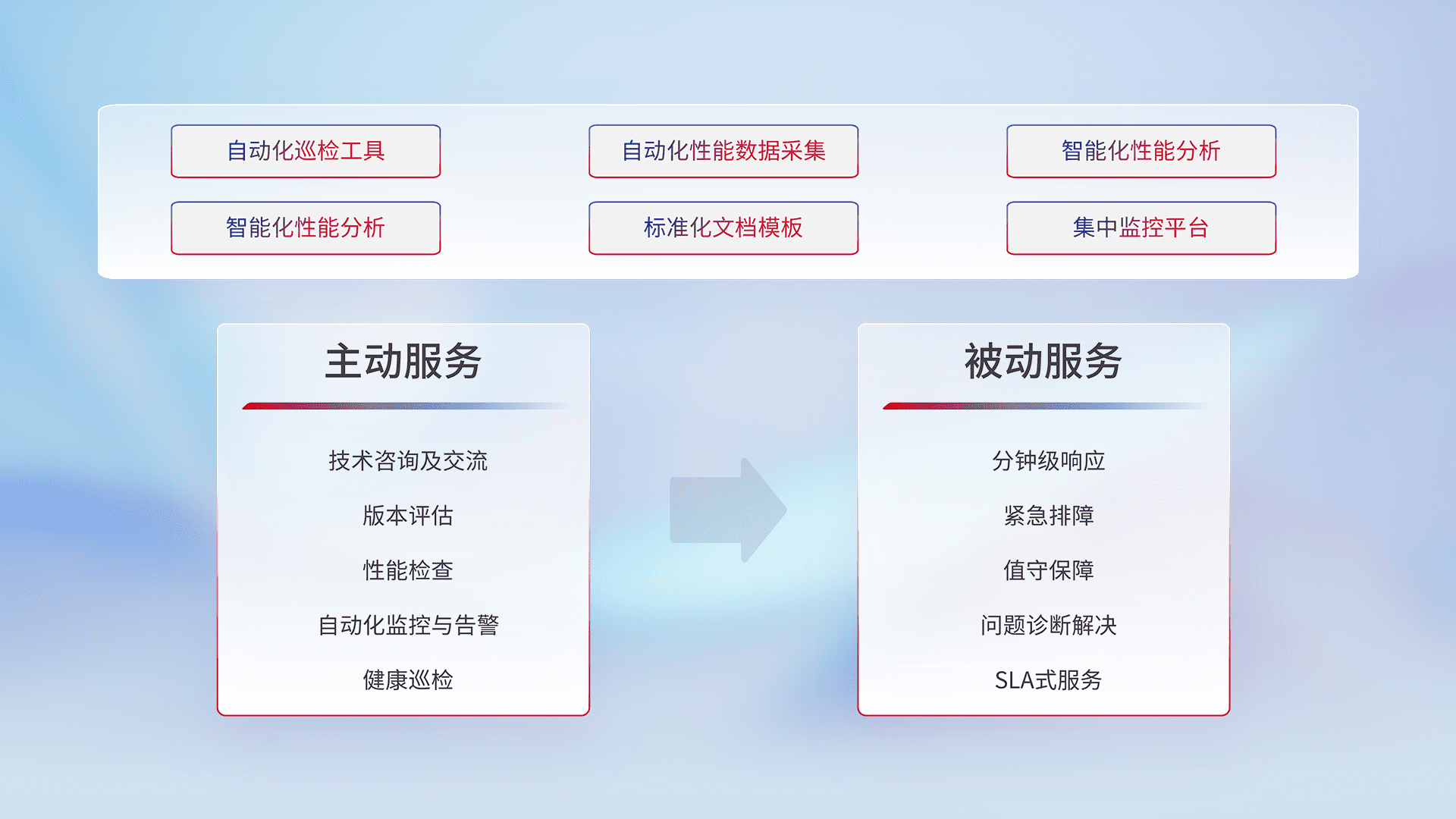 智能化工具和标准化文档,,保障服务质量,,,提供主动服务(包含技术咨询、、、、版本评估、、、性能检查、、自动化监控与告警、、、健康巡检)和被动服务包含(分钟级响应、、、、紧急排障、、、值守保障、、、、问题诊断解决、、、、SLA服务)。。