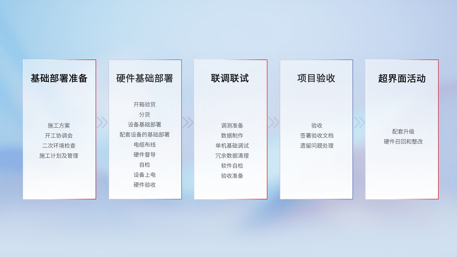 从基础部署准备、、、硬件基础部署、、、联调联试、、、项目验收、、、越界面活动的全过程可追溯,,,保证施工质量和进度。。。。
